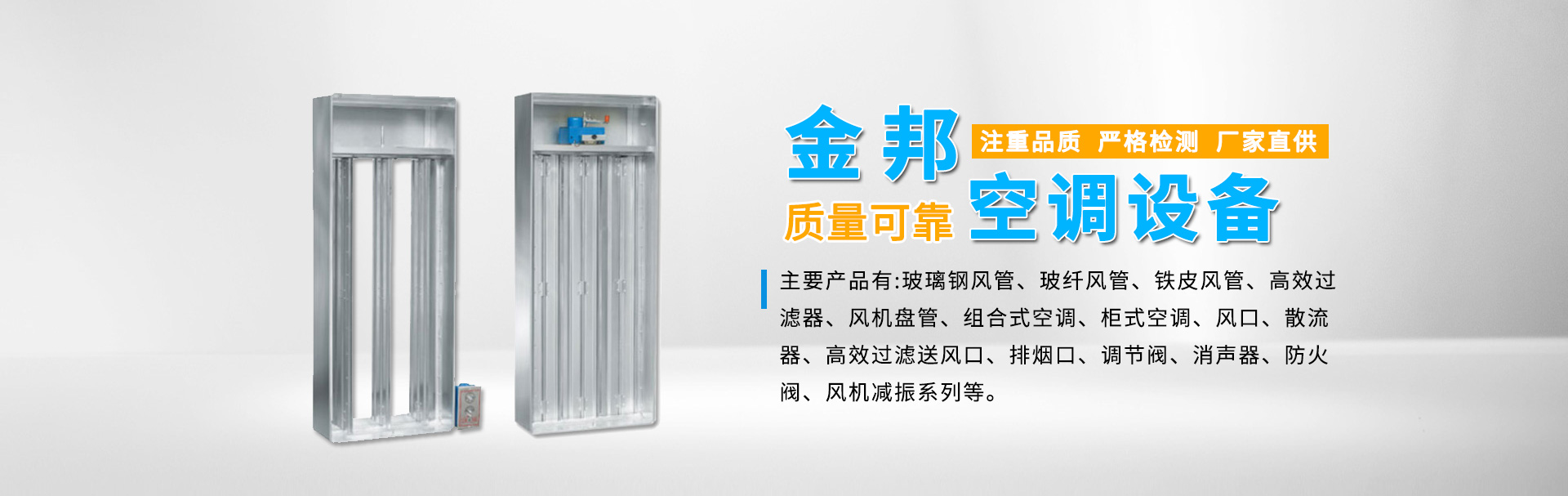 江蘇金邦空調(diào)設備制造有限公司專業(yè)生產(chǎn)玻璃鋼風管、玻纖風管、鐵皮風管、高效過濾器、風機盤管、組合式空調(diào)、柜式空調(diào)、風口、散流器、高效過濾送風口、排煙口、調(diào)節(jié)閥、消聲器、防火閥、風機減振系列等產(chǎn)品